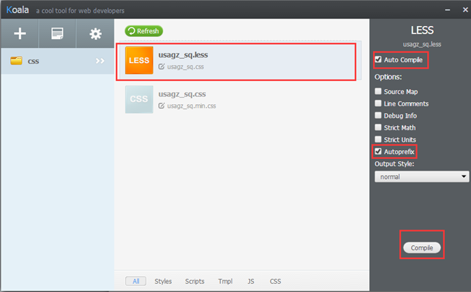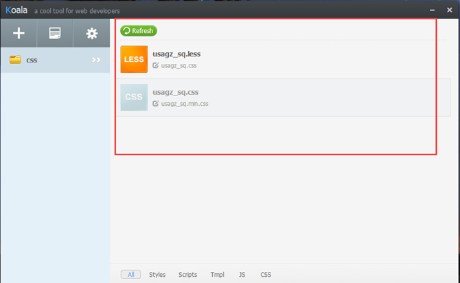 (2).新建css文件夹,把less文件放入文件夹中,打开安装好的koala,将整个css文件夹拖入koala中,less文件自动编译出.css文件