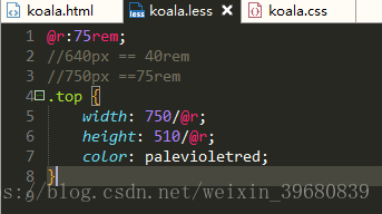 3.最最重要的一步来了,编辑器里面打开.less文件,如果设计稿的宽度是640的话,那么1rem=40px,如果设计稿是750的话,1rem=75px,以设计稿宽度为750px的话,这样less中就可以直接写:750/@r
