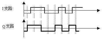 在OQPSK中,其I支路比特流和Q支路比特流在数据沿上差半个符号周期,其它特性和QPSK信号类似。在QPSK信号中,奇比特流和偶比特流的比特同时跳变,但是在OQPSK信号中,I支路比特流和Q支路比特流,在它们的变化沿的地方错开一比特(半个符号周期)。它们的波形如图下图: