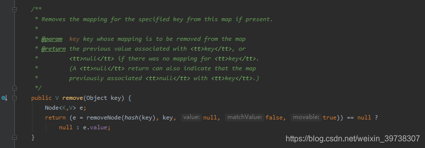 同样是没有返回删除的value,用一个boolean类型的返回值代表删除成功或者失败。虽然没有注释,但是根据上面一个remove的分析可以看出,这里的remove方法是删除key与value都匹配的键值对。