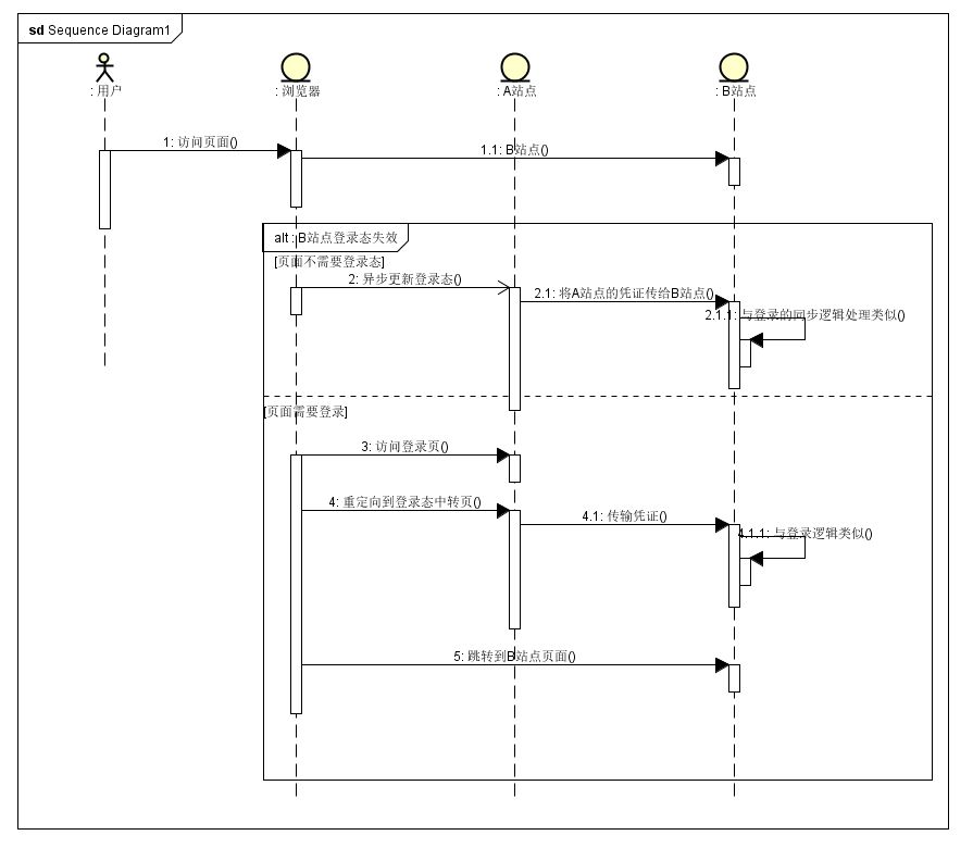 上面描述的是当用户首次登录时的同步流程,还需要考虑其他场景,比如,B 站点获得的登录态失效了,这时候访问 B 站点页面,就需要在一次前往 A 站点同步登录态。B 站点上的页面分为两种,一种是需要登录态才可以访问的,一种是不需要登录态就可以访问的。第一种情况下,需要重定向到 A 站点,为啥要绕回去呢?因为此时我们也不确定A 站点的登录态是否也失效了,所以需要回到 A 站点判断 A 站点当前的登录态,若 A 站点登录态也失效了,那么就去登陆页进行重新登录,若 A 站点是有登陆态的,那么只要在做一次同步登录态的操作即可。我们还是画图,清晰一些,如下: