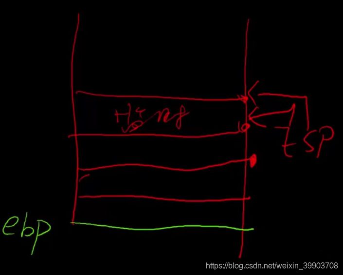 采用栈为什么就不会消耗大量的性能呢? 因为栈中有ebp时针(游标1)用来存储初始使用变量的位置,每使用一个临时变量就会占用栈的一部分空间,再拿esp寄存器(游标2)存储最高点使用变量的位置,使用完成这些变量之后我们释放掉时,根部不要采用清空栈的方式,只需要将esp指针和ebp指针重合即可清空,如下图结构示意图所示。