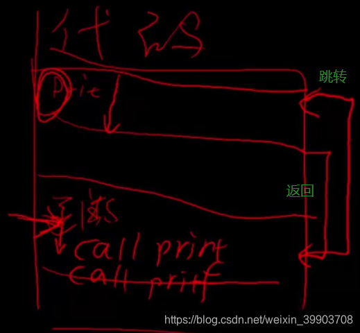 程序调用函数时就会执行别的函数体里面的东西,下图分析一下程序调用函数的执行过程:有专门的代码空间存储一个个的小的片段(函数),程序执行的时候是根据程序计数器来执行,我们执行到 call print,这是就会跳转到print函数,执行完print函数之后我们还需要回到原来执行的位置。
