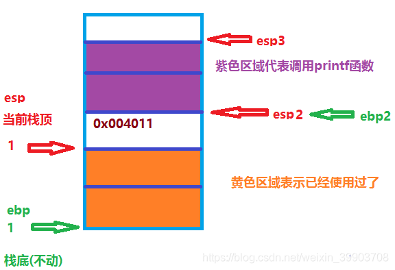 怎么回到原来执行的位置呢?这时我们就可以使用栈:当我们程序执行到esp的1位置时,遇到call时我们会将当前函数的地址0x004011存储到栈中(此时esp上移到2位置)与此同时我们将ebp的1位置移动到ebp的2位置此时我们还需要将ebp的1位置记录一下。开始执行print函数(紫色区域),此时esp上移到3的位置,printf函数执行完成之后我们将esp的3位置移动到esp的2位置这样就实现了将函数的释放,return回到了调用printf函数的位置ebp2,然后继续执行下面的其它函数。