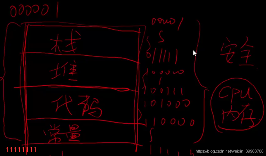 程序在编译的时候会将内存分为下图所示的几个区域来存储不同的代码,目的是为了保证安全,因为C/C++语言是可以操作内存的语言,万一不小心将指针指向了代码区域并且修改了,这样程序就挂掉了。
