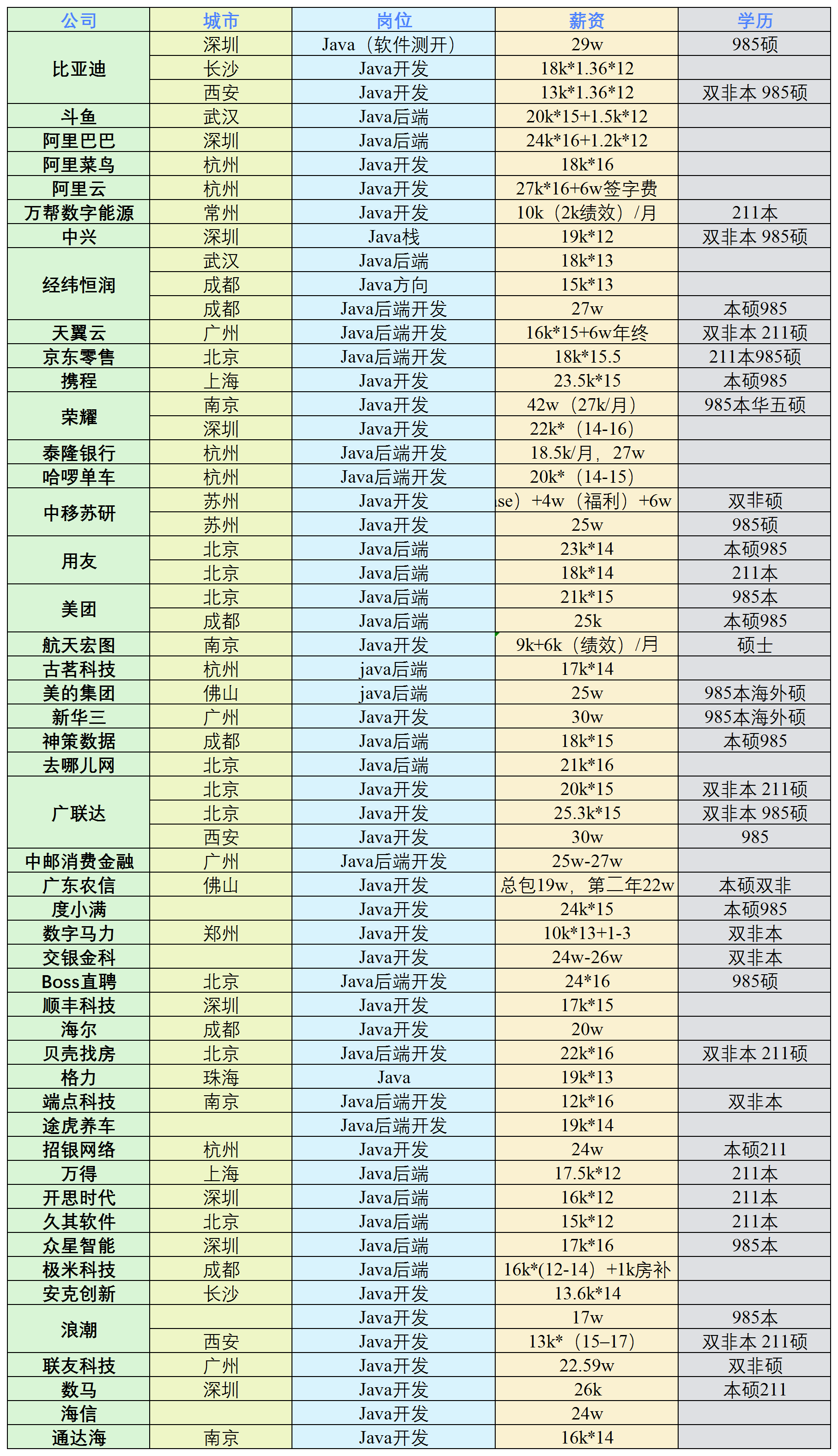 针对 23 届秋招 Java 相关岗位薪资情况,总结了一份薪资汇总情况,供参考。