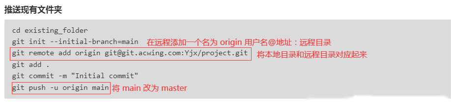 git remote add origin git@git.acwing.com:xxx/XXX.git:建立一个链接,将本地仓库对应连接到远程仓库,云端名字叫origingit push -u(第一次需要 -u,以后不需要):将本地仓库当前所在分支推送到远程仓库。