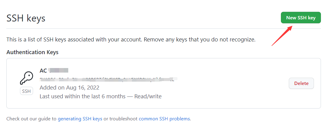 Settings,点击如下图所示的SSH and GPG keys选项,点击New SSH key,将复制好的公钥粘贴到此处。