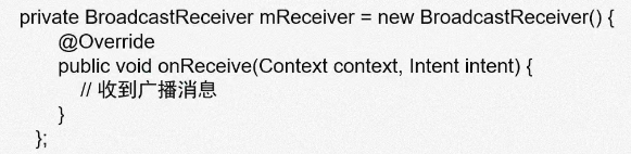 BroadcastReceiver类(广播接收器),继承或者直接new该类的对象实例,重写onReceive方法,在该方法中处理接受到的广播消息。