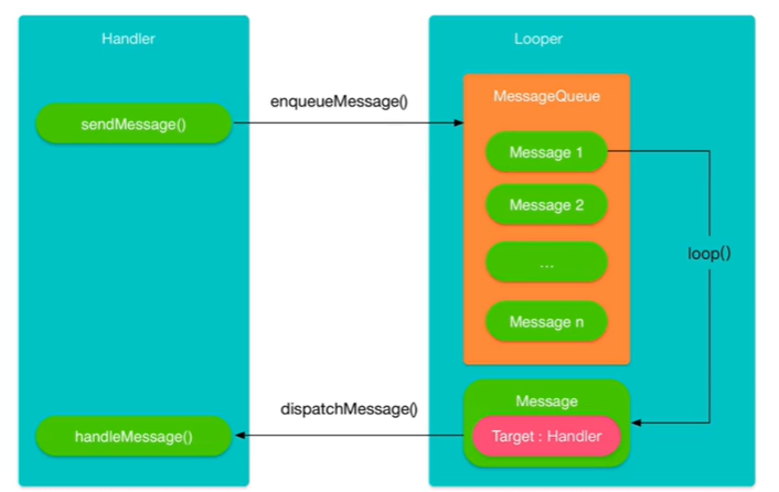 handleMessage():处理消息;Message:消息;给主线程发送的一些事件/通知;包含线程间通信的描述和数据;