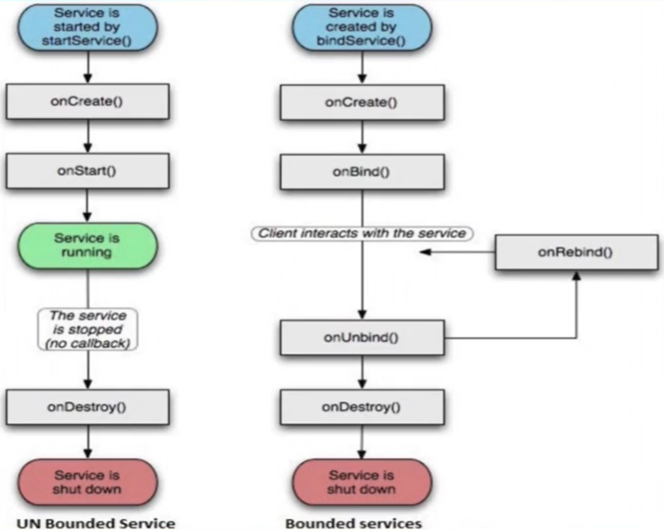 bindService:场景:在音乐app中进行播放和操作,需要进行 Service 与 Activity 进行交互,需要与 Activity 进行绑定;