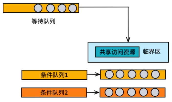 - 0 或多个条件变量:当进程获取到了锁的请求进入到临界区之后,有可能还需要做多个条件的判断,如果没有满足其中的某一条条件则需要进入到条件队列(条件队列位于临界区外)中,若后续条件满足,则由其他进程进行唤醒。