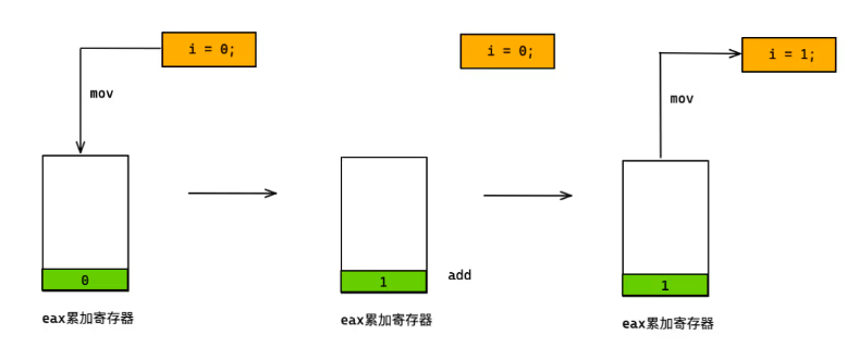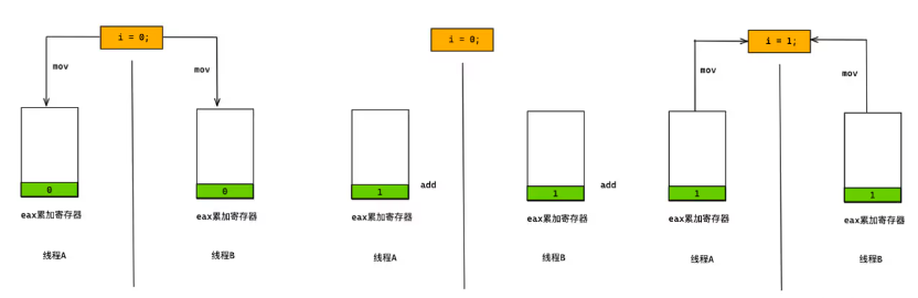多个线程同时使用i++指令的时候就可能会出现如下图的冲突,不同线程在执行的时候,各自的 eax 累加寄存器中的数值不相同,从而导致最终i被两次更新,但值却不是 2。