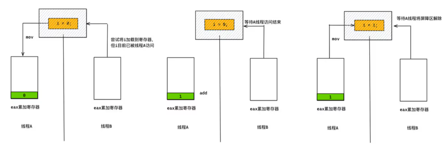 解决此类问题:只需要保证每个线程在执行i++ 指令的时候都是一个原子操作即可,例如通过加入一道屏障指令;