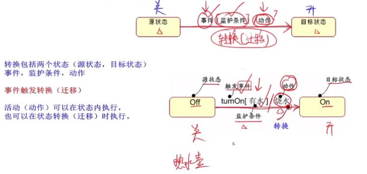 - 状态图:转换箭头上有事件名称