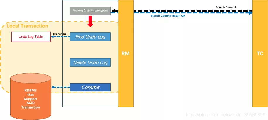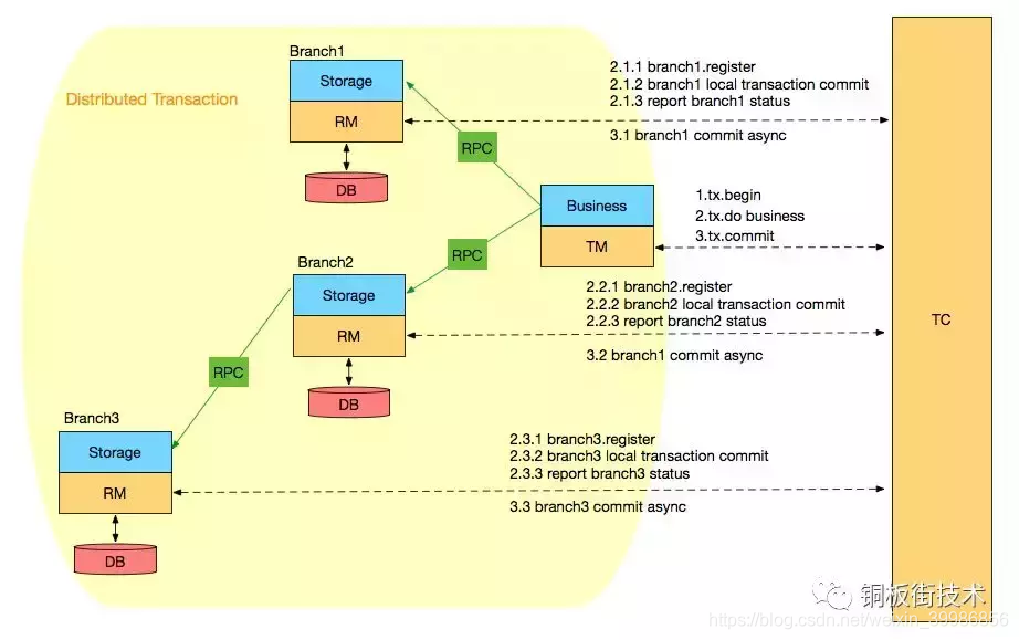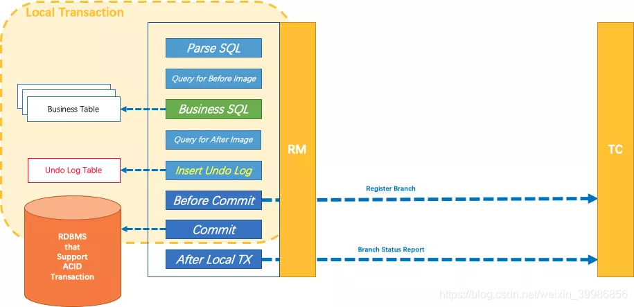 1、第一阶段如上图所有的RM执行自己的本地事务。在执行本地事务时,用大白话讲其实就是jdbc执行sql时,seata使用了数据源代理,在执行sql前,对sql进行解析,生成前置镜像sql,后置镜像sql,同时向undo log插入一条数据,方便后期万一出现异常做回滚,然后向TC注册分支事务,提交本地事务,最后向TC提交它的分支事务状态。