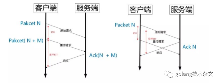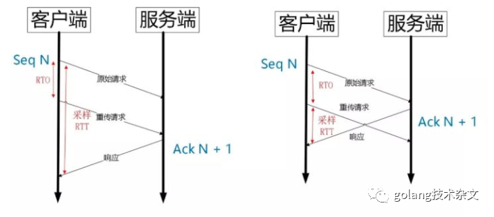 网络出现拥塞一般指的是数据在传输的过程中过多的数据注入到网络,从而导致分组的丢失,此时发送方会继续重传,从而导致网络的拥塞程度更高。在重传的过程中TCP的seq保持不变,这样会导致一个问题就是客户端不知道收到的seq是重传的seq还是原始请求的seq,如下图所示,如果原始sql被判断成重传的seq,会导致RTT增大,如果重传的seq被判断成原始的seq,就会导致计算的RTT偏小。