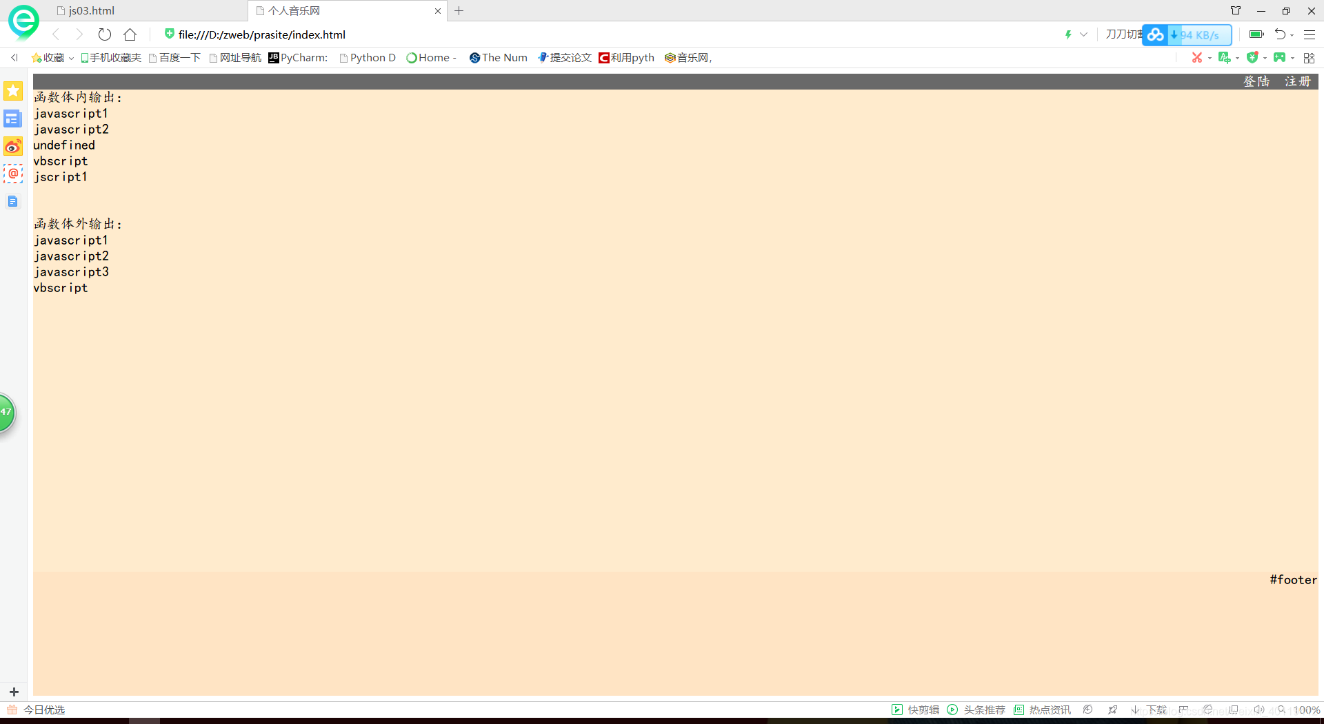 本文介绍了一个使用HTML、CSS和JavaScript构建的个人音乐网页。页面采用居中布局,包含头部、主体和底部区域,头部提供登录和注册链接。JavaScript部分展示了作用域的概念,包括全局变量和局部变量的使用。