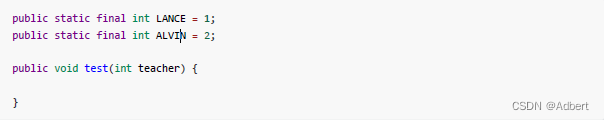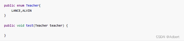 如:我们定义方法test ,此方法接收参数teacher 需要在:Lance、Alvin中选择一个。如果使用枚举能够实现为:
