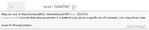 此时,我们再去调用test 方法,如果传递的参数不是LANCE 或者ALVIN 则会显示 Inspection 警告(编译不会报错)。
