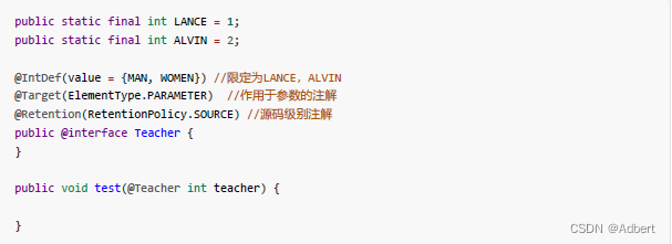 然而此时,调用test 方法由于采用基本数据类型int,将无法进行类型限定。此时使用@IntDef增加自定义注解: