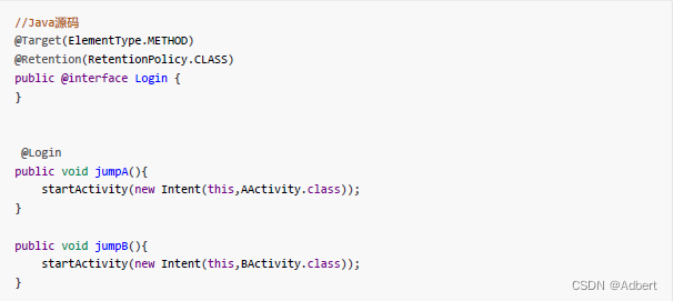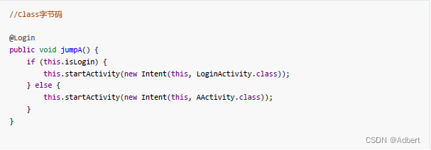 在上诉代码中, jumpA 方法需要具备登录身份。而Login 注解的定义被设置为CLASS 。因此我们能够在该类所编译的字节码中获得到方法注解Login 。在操作字节码时,就能够根据方法是否具备该注解来修改class中该方法的内容加入if-else 的代码段: