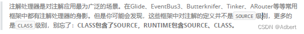 定义为CLASS 的注解,会保留在class文件中,但是会被虚拟机忽略(即无法在运行期反射获取注解)。此时完全符合此种注解的应用场景为字节码操作。如:AspectJ、热修复Roubust中应用此场景。