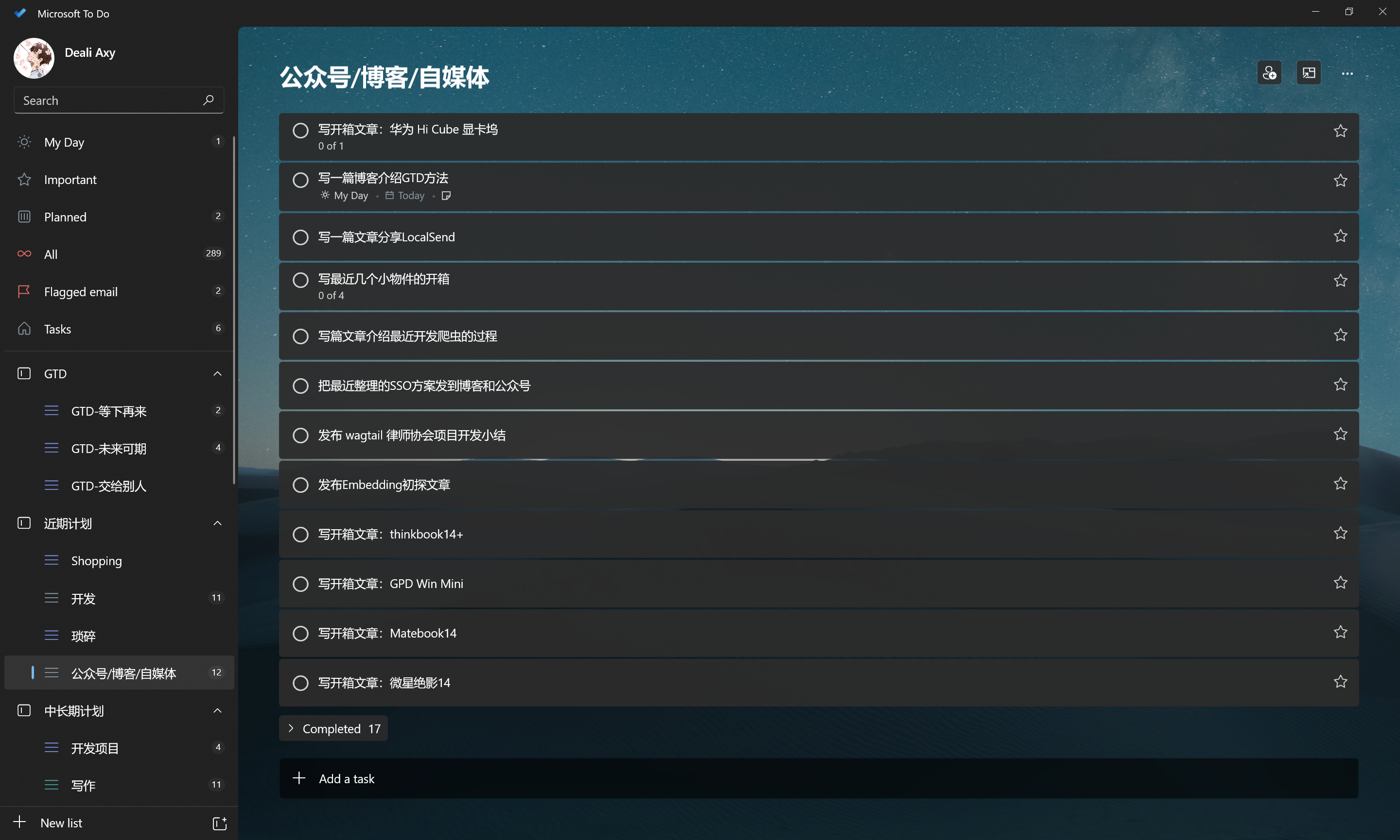 本着「不要把时间浪费在选择工具」的原则,为了快速开始GTD,我直接使用之前用来当备忘录的「Microsoft Todo」