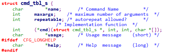 下面这个是来分析我们传入的参数argv[]和保存起来,中间的cmdtp结构体就是我们刚才假设的那个结构体,有名称,最大参数,重复等,int (*cmd)(struct cmd_tbl_s *, int, int, char *[]);这句就是命令对应要执行的功能函数,char *usage; /* Usage message (short) */和char *help; /* Help message (long) */是短的和长的帮助信息。短的:help 长的:help ls