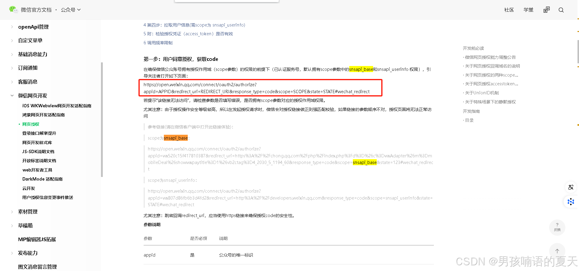 redirect_uri:授权用的回调页面,就在这个页面中获取code,再通过code调用后台接口获取到openid,要注意,这个回调页面的地址必须在授权的域名下,否则调用会失败