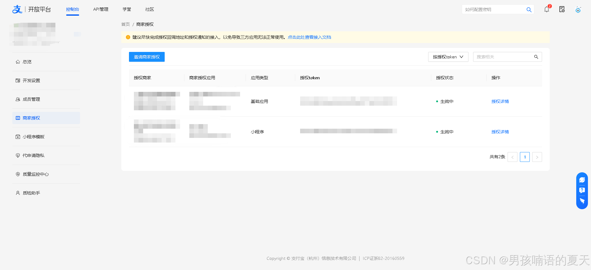 9、看到两个商户都在第三方应用中,准备工作就差不多了,注意:这里授权token就是 下面代码中要传入 的第三方授权应用中的app_auth_token!!!