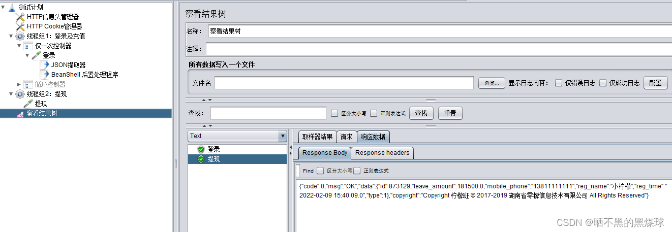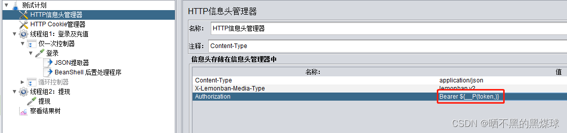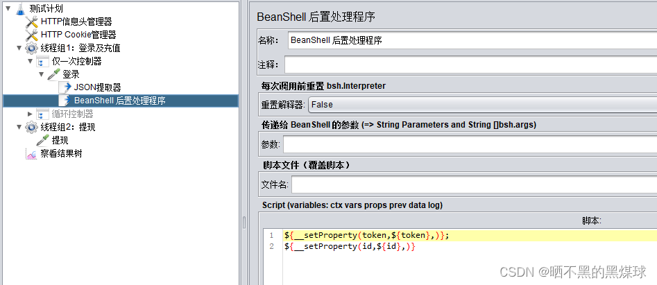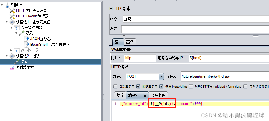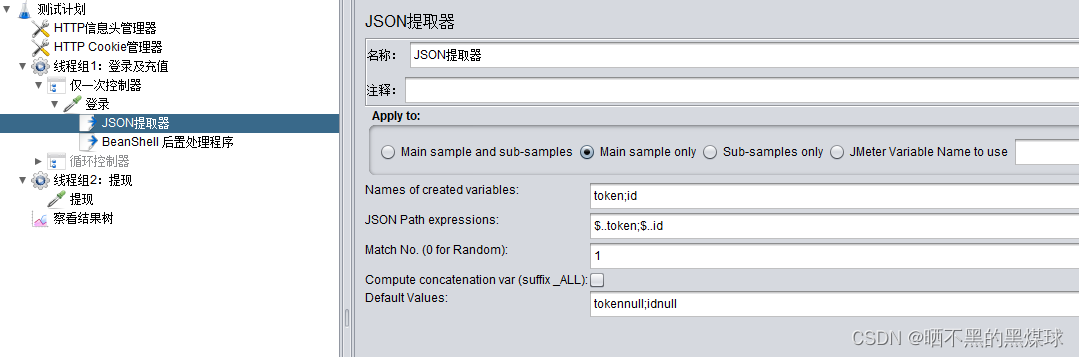 1.把提现需要用到的token及id的值,先提取出来,我这里用的json提取方式,具体设置步骤可以参考此文章Jmeter-提取器、CSV读取文件的设置_晒不黑的黑煤球的博客-优快云博客