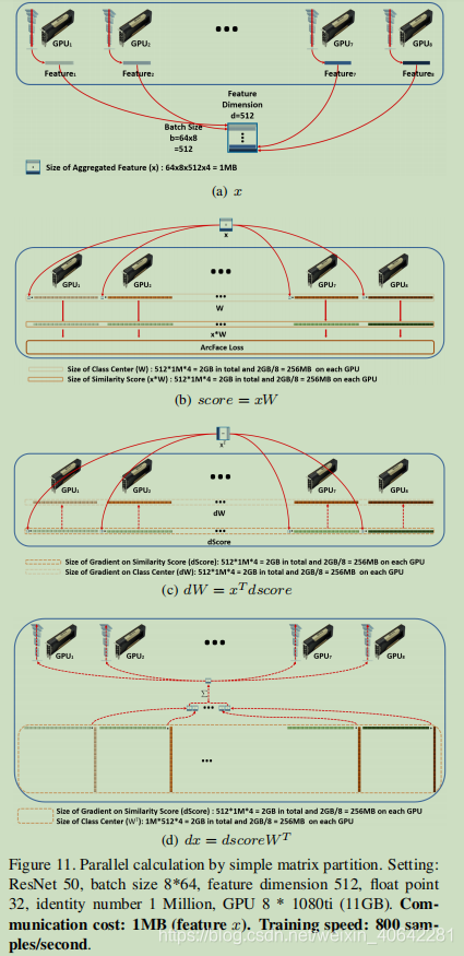 (1)获取特征(x)。面部嵌入特征从8个GPU卡聚集到一个特征矩阵(批大小8 * 64×特征尺寸512)中。汇总后的特征矩阵的大小仅为1MB,传输特征矩阵时的通信成本可以忽略不计。