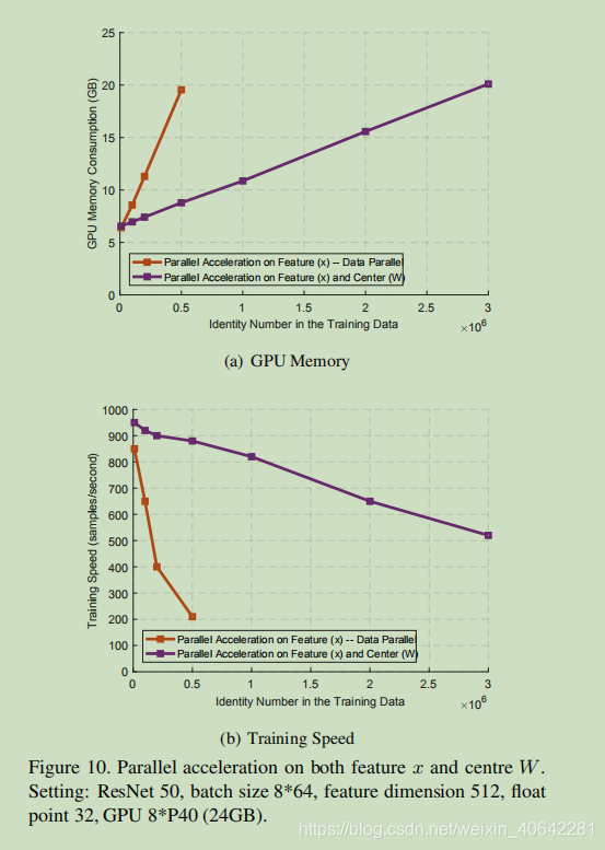 如图10所示,我们在特征x和中心W上的并行加速可以显着减少GPU内存消耗并加快训练速度。即使对于使用8 * 1080ti(11GB)训练的一百万个身份,我们的实现(ResNet 50,批处理大小8 * 64,特征尺寸512和浮点32)仍然可以每秒800个样本的速度运行。与[47]中提出的近似加速方法相比,我们的实现没有性能下降。