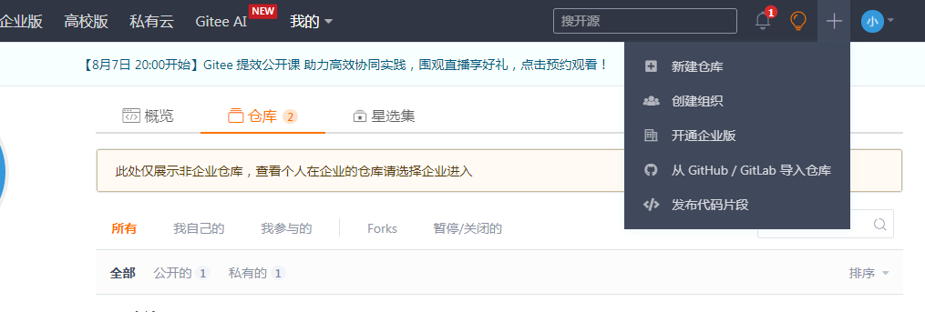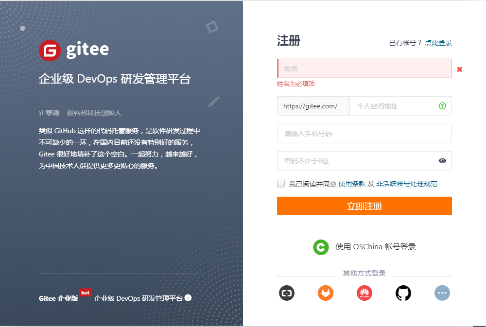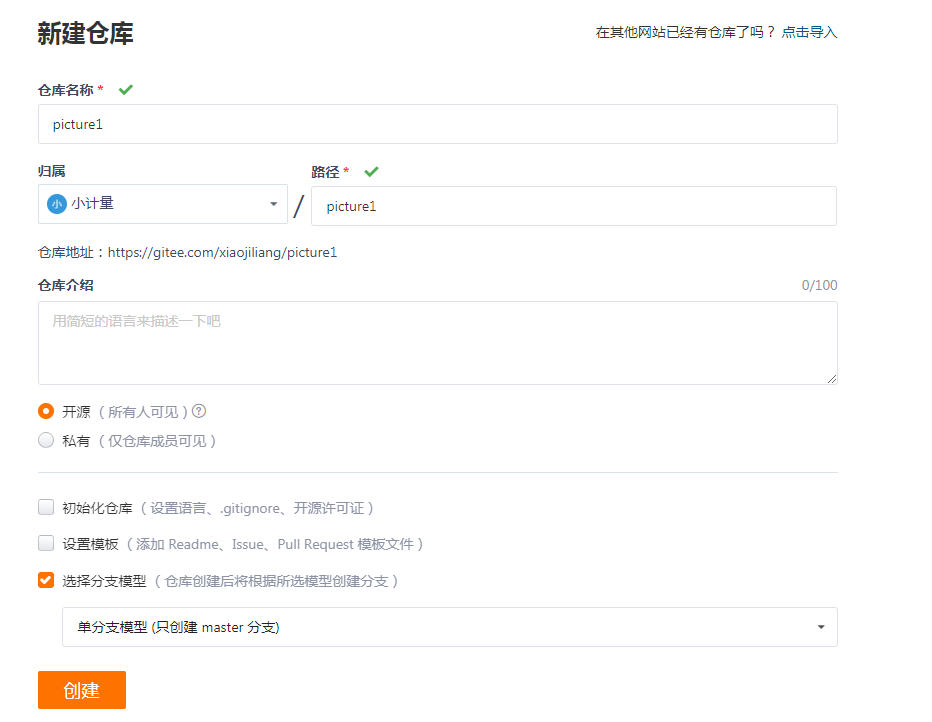 填入仓库名称,选择开源、选择分支模型,最后点击创建。
