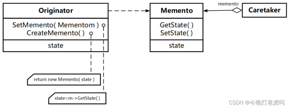 *Originator(原发器) 创建一个备忘录,用于记录当前时刻它的内部状态;使用备忘录恢复内部状态。