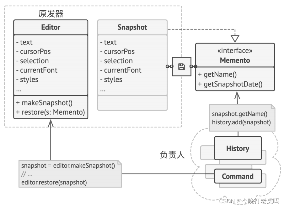 这种限制策略允许你将备忘录保存在通常被称为负责人(Caretakers)的对象中。由于负责人仅通过受限接口与备忘录互动,故其无法修改存储在备忘录内部的状态。同时,原发器拥有对备忘录所有成员的访问权限,从而能随时恢复其以前的状态。