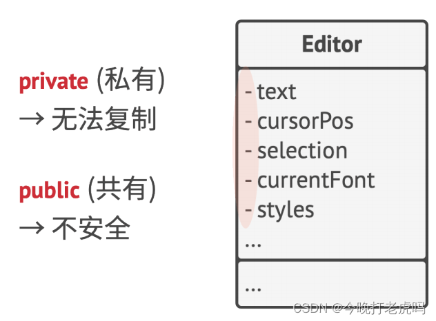 让我们来思考一下这些状态快照。首先,到底该如何生成一个快照呢?很可能你会需要遍历对象的所有成员变量并将其数值复制保存。但只有当对象对其内容没有严格访问权限限制的情况下,你才能使用该方式。不过很遗憾,绝大部分对象会使用私有成员变量来存储重要数据,这样别人就无法轻易查看其中的内容。