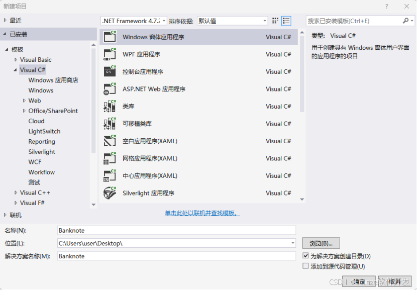 2.项目名称 -- “Banknote” ,位置 -- “C:\Users\Administrator\Desktop” ,勾选 “将解决方案和项目放在同一目录中” ,框架 -- “.NET Framework 4.7.2” 。 点击 “创建”