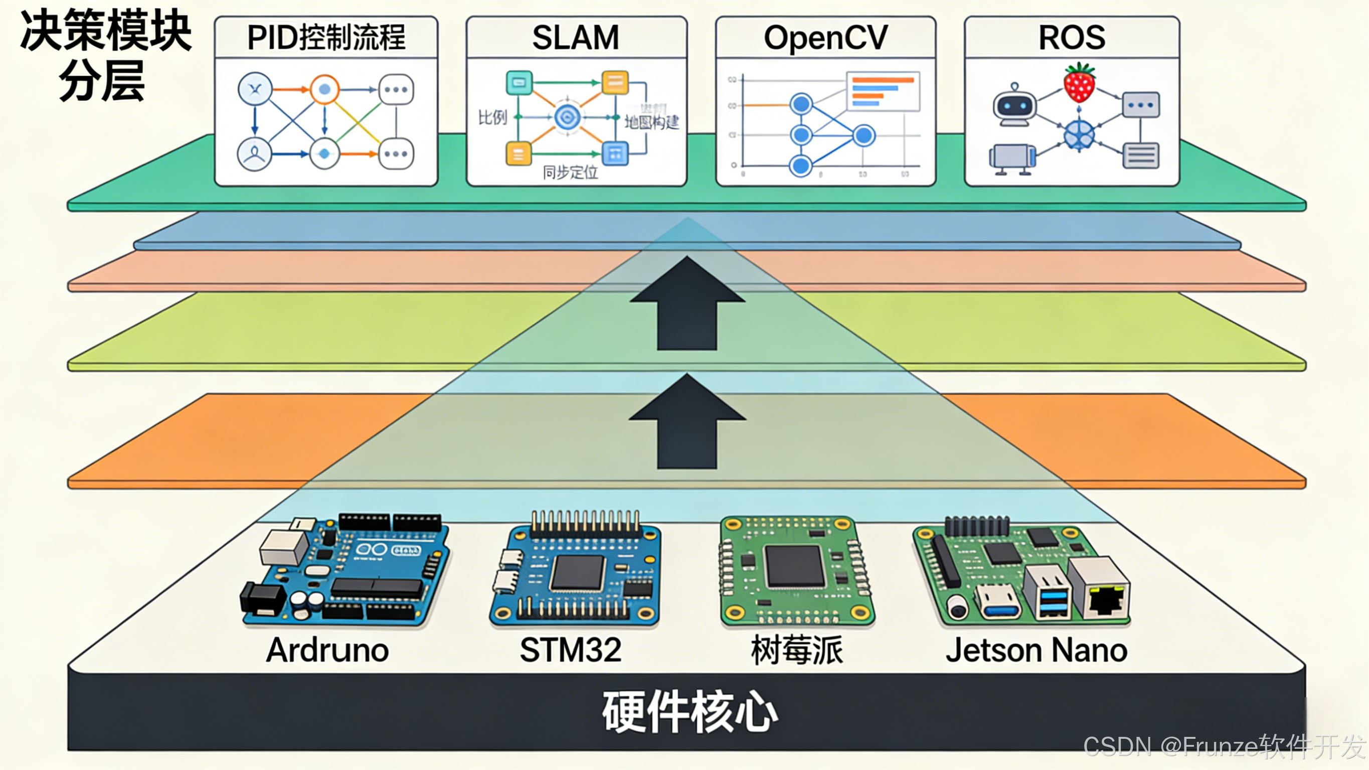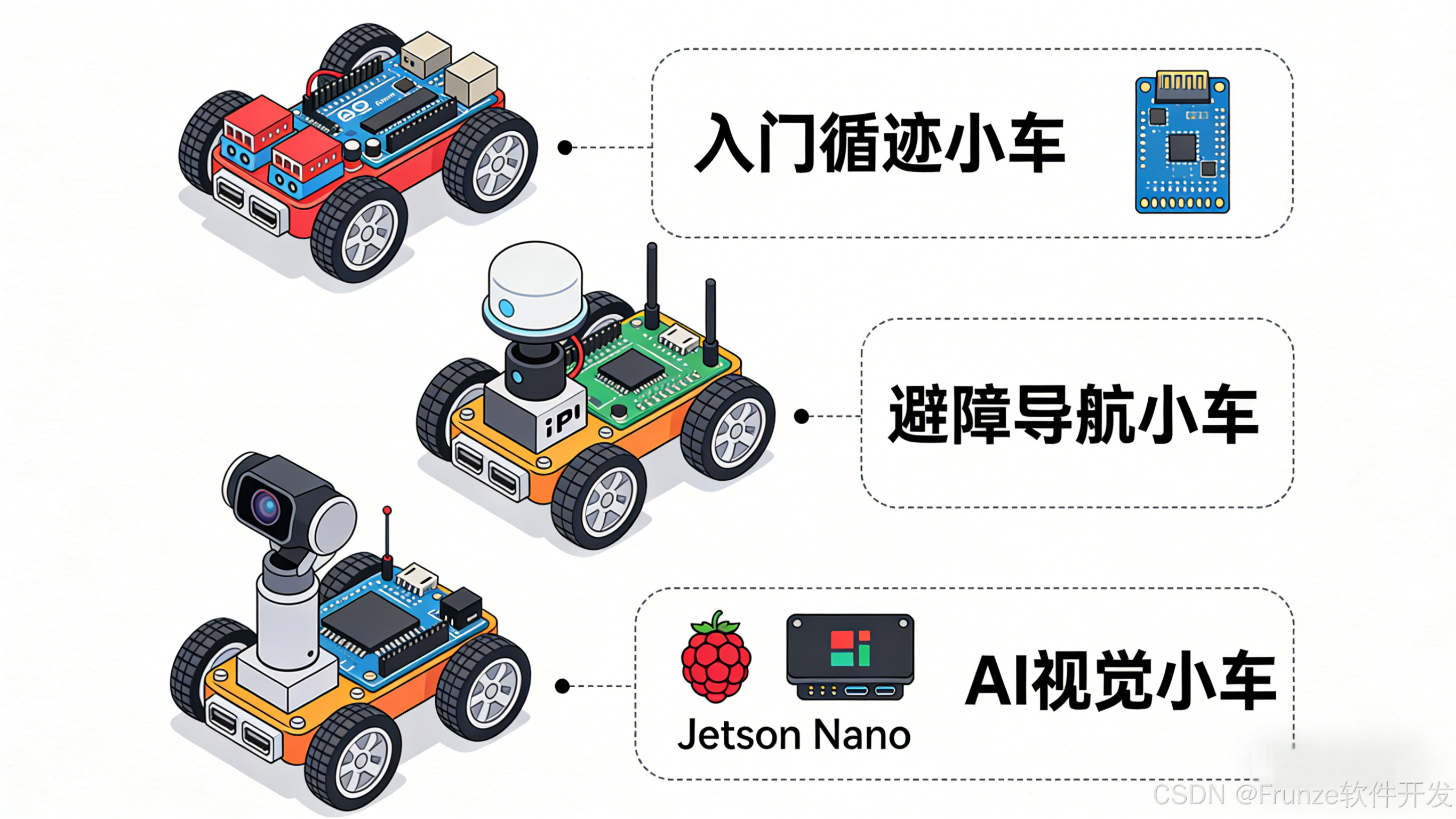 硬件选型:优先使用开源硬件(如Arduino、树莓派、ESP32),避免定制化硬件(如定制PCB);传感器选用入门级型号(如HC-SR04超声波模块、IR循迹模块),而非工业级高精度型号;