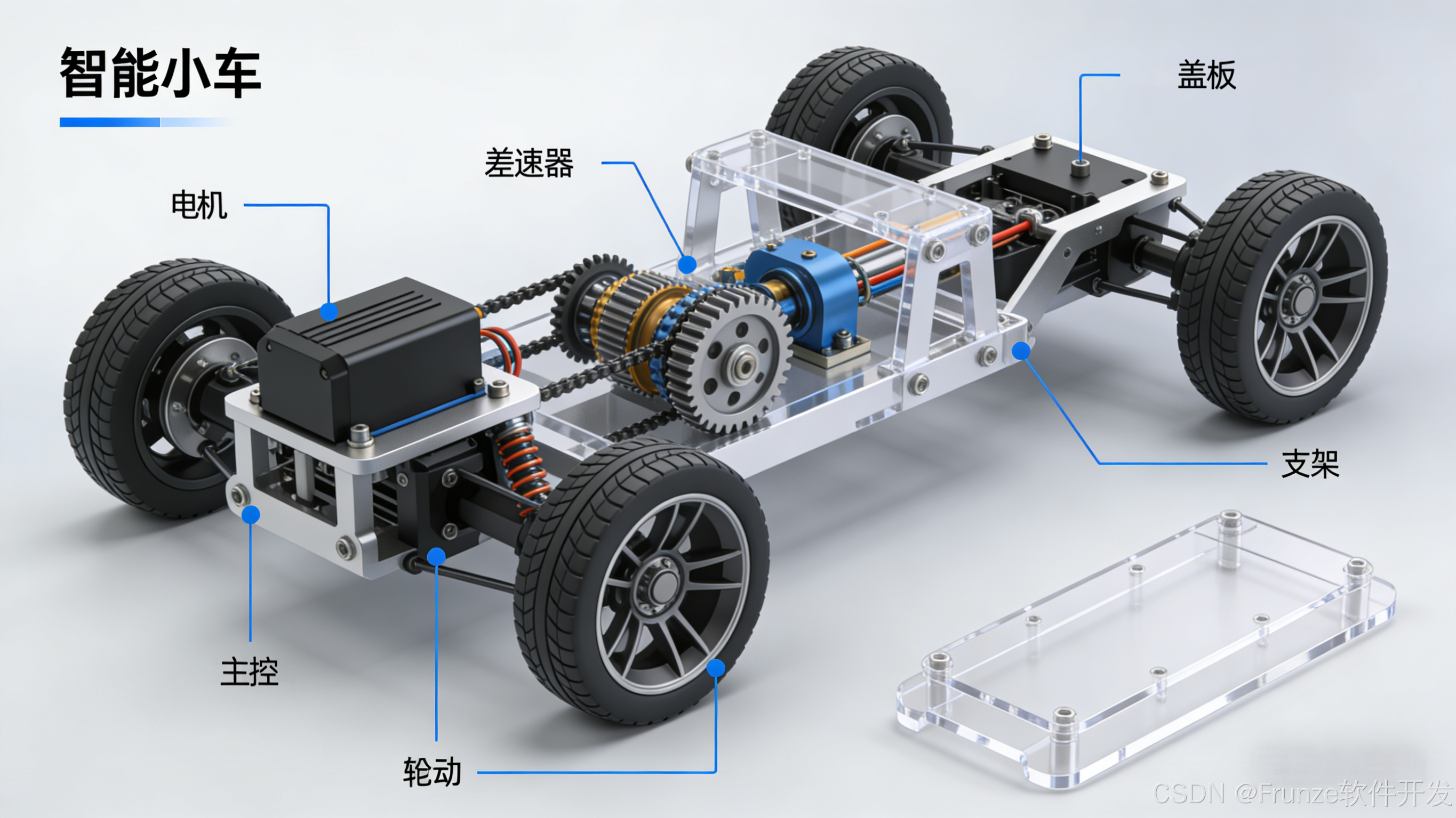 差速底盘:核心结构为左右两组独立驱动轮+从动轮(1-2个),通过控制左右轮转速差实现转向。优势是结构简单、成本低、机械损耗小,适合入门级项目(如循迹小车)、室内平坦场景(如办公区服务机器人);局限性是转向时存在离心力,无法实现原地旋转(部分优化结构可实现但稳定性下降),高速转向易侧翻。设计关键参数:轮距(影响转向灵活性)、轴距(影响行驶稳定性)、离地间隙(需匹配场景障碍物高度,一般≥2cm)。