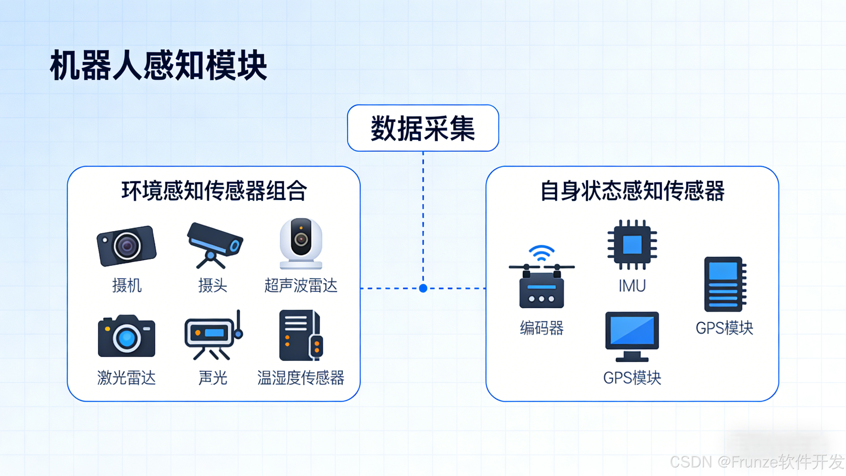 感知模块负责采集外部环境和机器人自身状态数据,是决策模块的核心依据,相当于机器人的“五官”。按采集对象可分为环境感知和自身状态感知两类,不同传感器的组合的搭配,决定了机器人的“感知能力”。