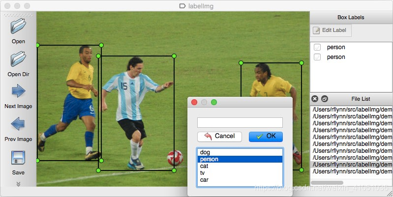 使用时,使用ctrl+u快捷键加载图片后,使用ctrl+r快捷键指定生成的xml文件的保存位置,然后开始按照类别将图片中的目标进行矩形框标注,每标注一个目标后软件自动弹出类别信息以供选择,在弹出的类别信息中选择对应的类别名称双击即可。当一张图片中各个类别所需要标注的目标全部标注后,点击保存按键或者使用ctrl+s快捷键保存就生成了相对应的xml位置信息文件,此时可以开始下一张图片的标注。