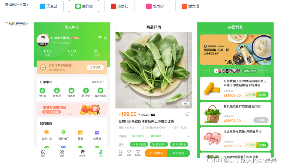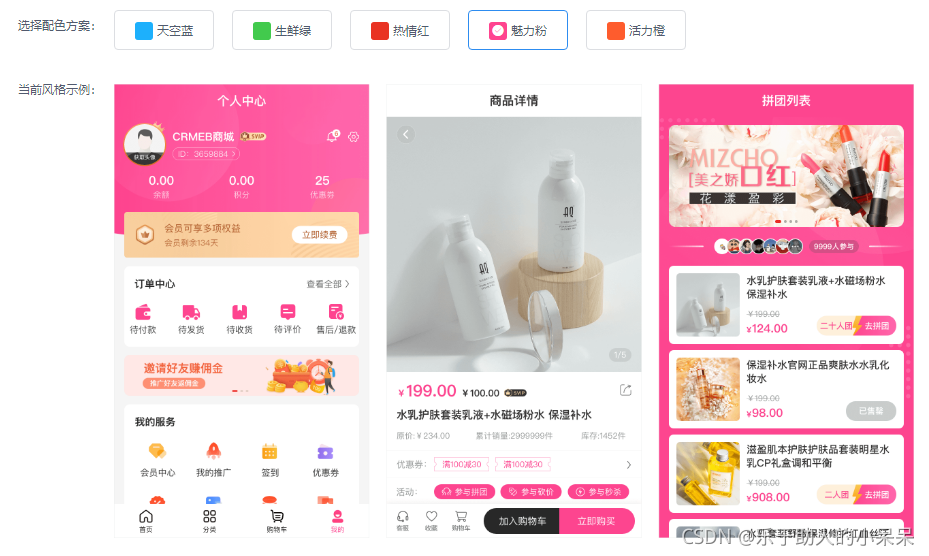 本文介绍了CRMEB PRO1.5版本新增的系统主题色自定义和首页DIY功能,允许用户根据需求调整商城的外观,包括五种预设主题色和首页背景色设置。此外,详细讲解了首页DIY的组件库使用,商品分类和个人中心页面的样式选择,以及订单中心的颜色匹配和个人中心广告位的自定义设置。