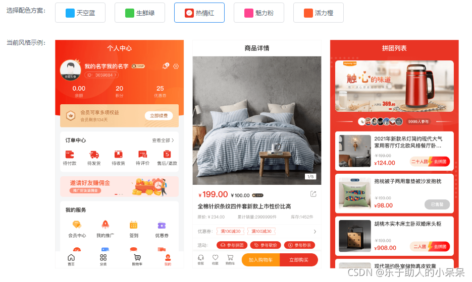 目前系统自设的五种主题色可以更换,分别是天空蓝,生鲜绿,热情红,魅力粉,活力橙,可以适应不同行业主题色的需求,首页背景色需单独设置,首页不随主体色改变而改变,二开其它更多主题色也特别简单方便,需要主题色二开文档可留言私发。