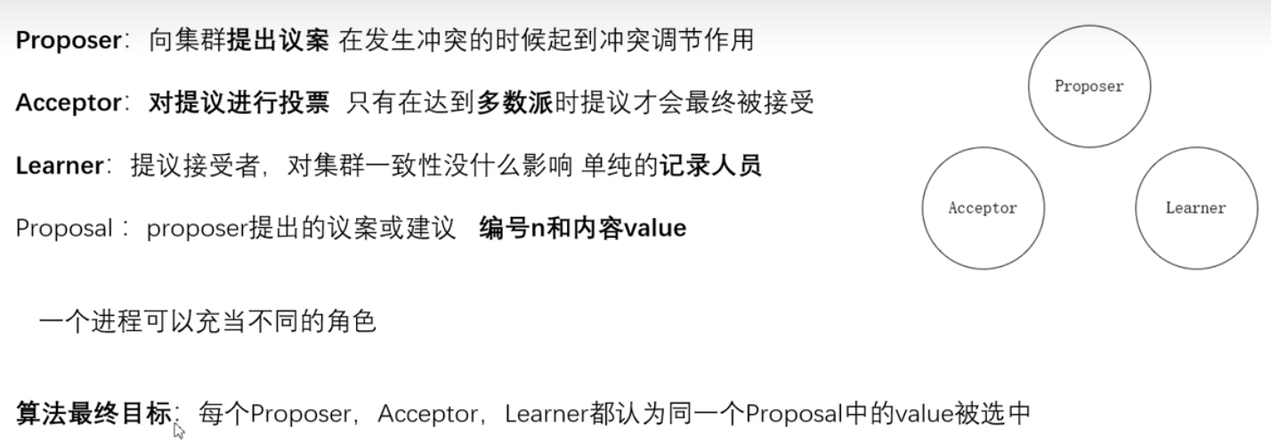 - 三个角色:提案者(proposer)、接受者(acceptor)、学习者(learner)