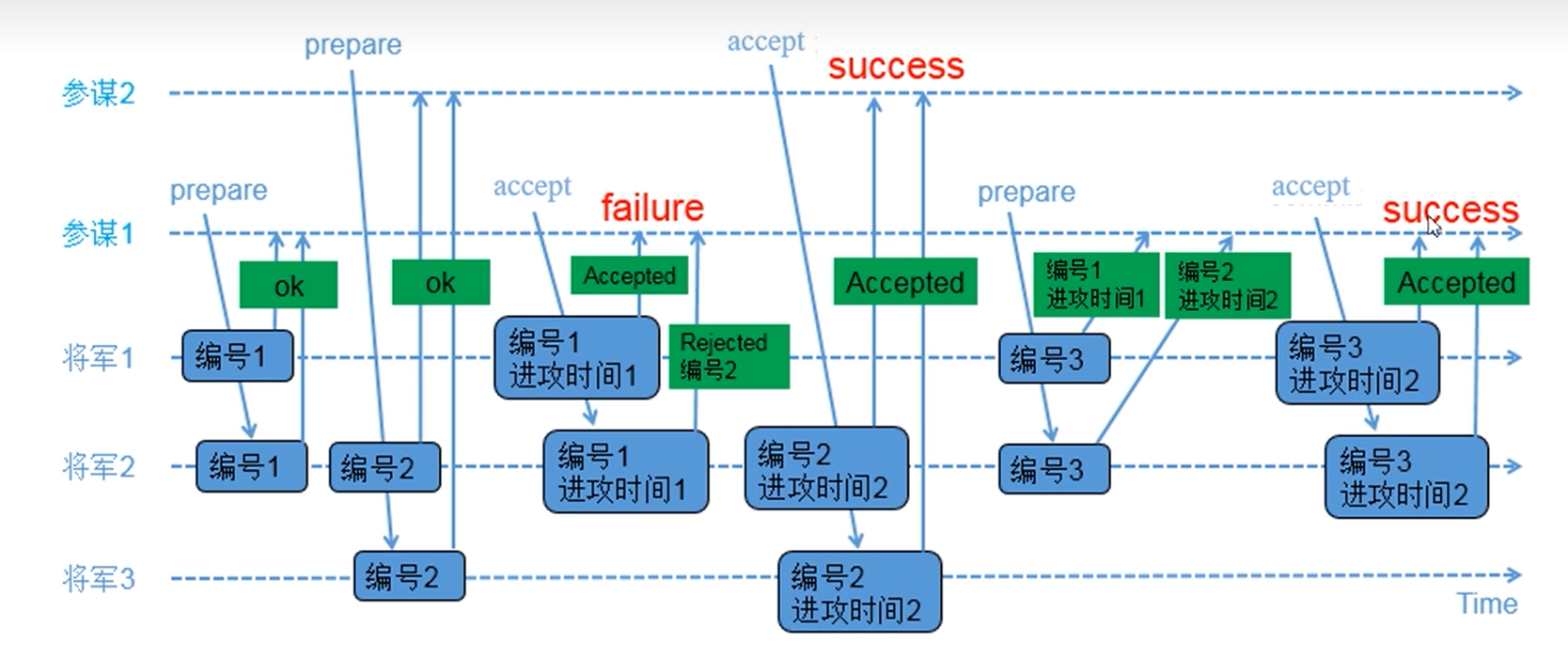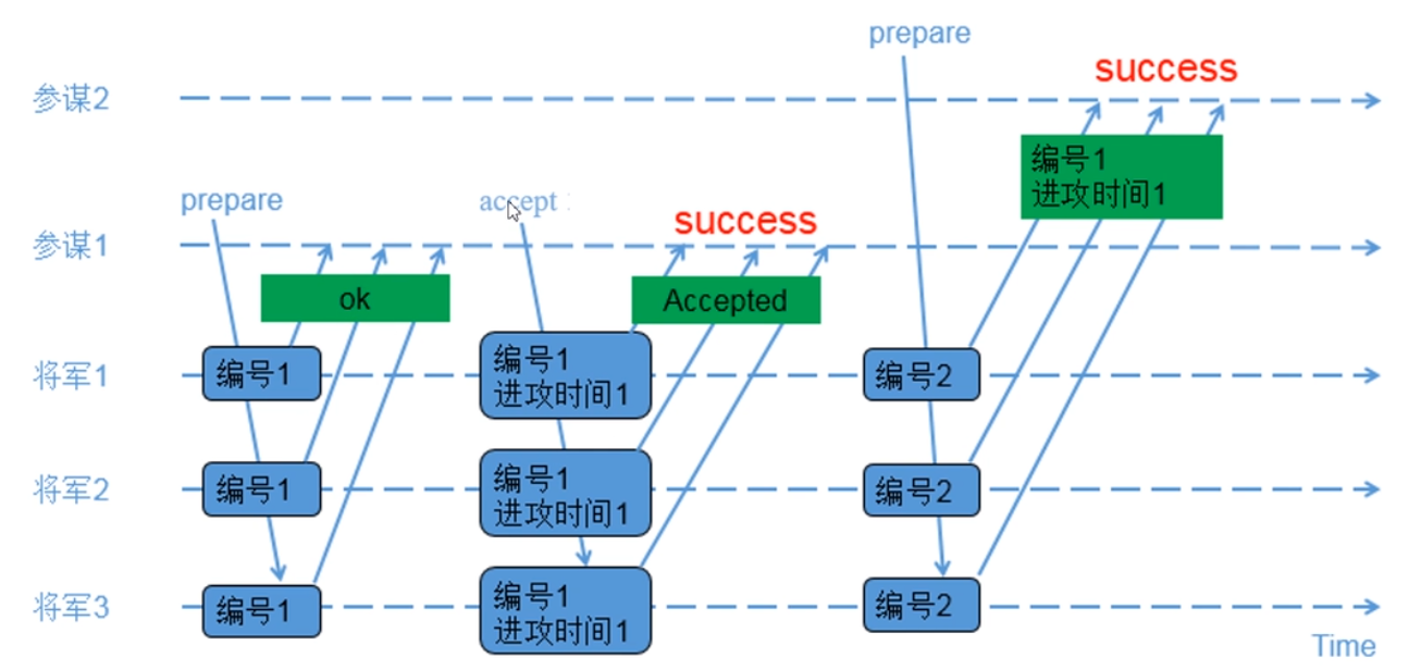 图一不完整,后面还有参谋1的accept失败返回<编号1, 进攻时间1>后,生成编号3再次进行prepare过程<编号3, 进攻时间2>,最终达成一致进攻时间2。