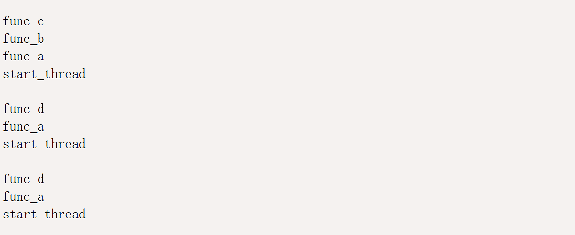 上面代码中,start_thread是启动线程,调用了func_a。后者又调用了func_b和func_d,而func_b又调用了func_c。
