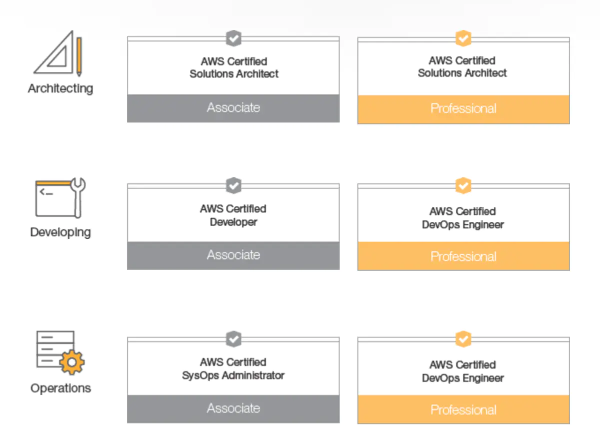 举个例子,如果想考取专家级解决方案架构师认证,那必须先考取助理级解决方案架构师认证才行。而要考取DevOps工程师认证,则先要考取开发者认证或SysOps系统管理员认证两个证中其中最少一个。