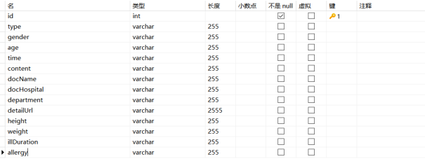 (3)病例信息表(病例种类、年龄、性别、时间、姓名、医院、科室、网址、身高、体重、症状时间,过敏史)